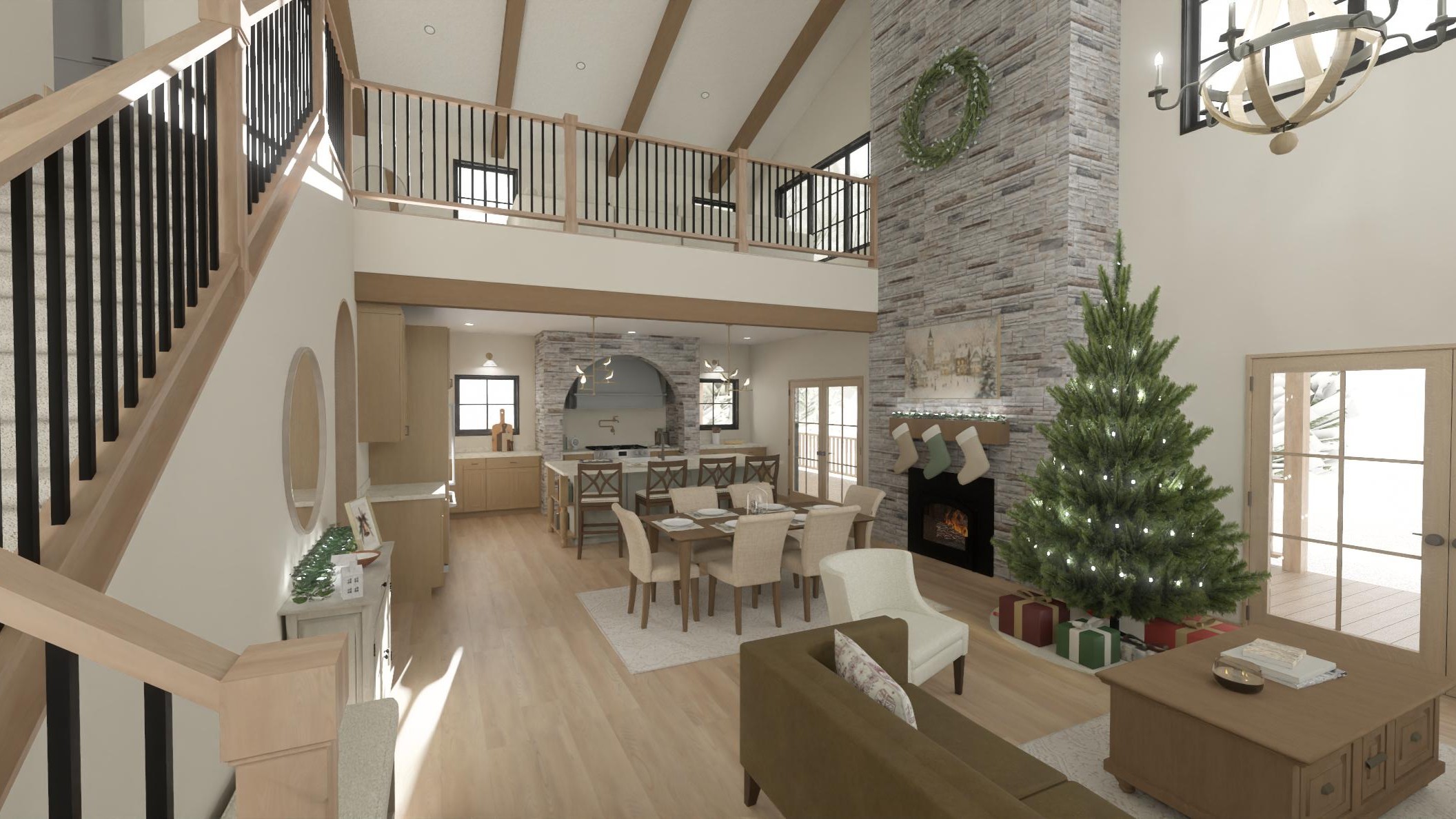 Step inside to a welcoming entry where the staircase opens to a loft overlooking the great room, connecting the living room and kitchen below. A stone archway over the oven makes a statement, while subtle touches like the hidden walk-in pantry seamlessly combine form and function.